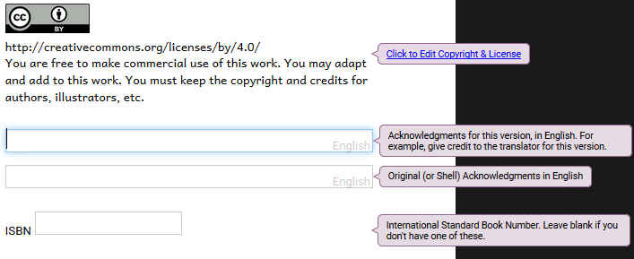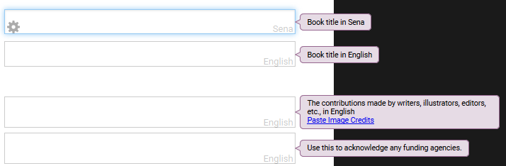 These yellow boxes inform you regarding what the associated text boxes should contain and the language of that content. If the book as a title in other languages, as shown here, tabs appear so you can see those titles. See Also: Contributions.