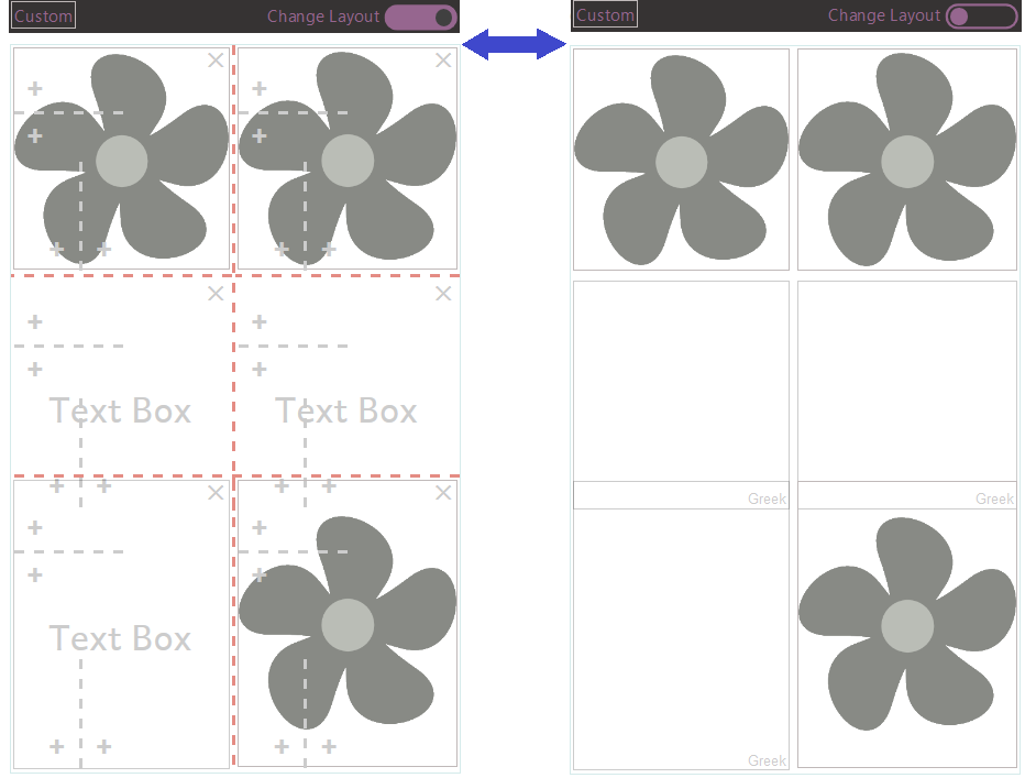 If you choose the Custom page template when you add a page, you can insert boxes in various different ways. This example shows the same custom page layout. The Change Layout controls are shown in the picture on the left. They are hidden in the picture on the right.