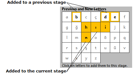 The remaining letters are not yet in any stage and you can click them to add them to the current state.